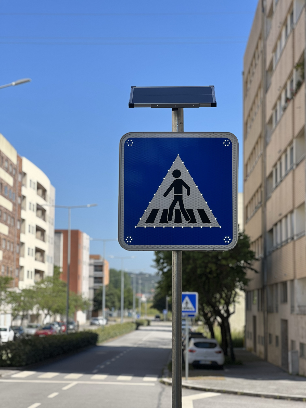 Os LEDs brancos de alta intensidade (31000 mcd) estão estrategicamente distribuídos à volta do triângulo de aviso, com funcionamento intermitente regulado por sensor crepuscular, que ajusta o brilho à luminosidade ambiente — uma solução inteligente e segura para qualquer cenário urbano.
